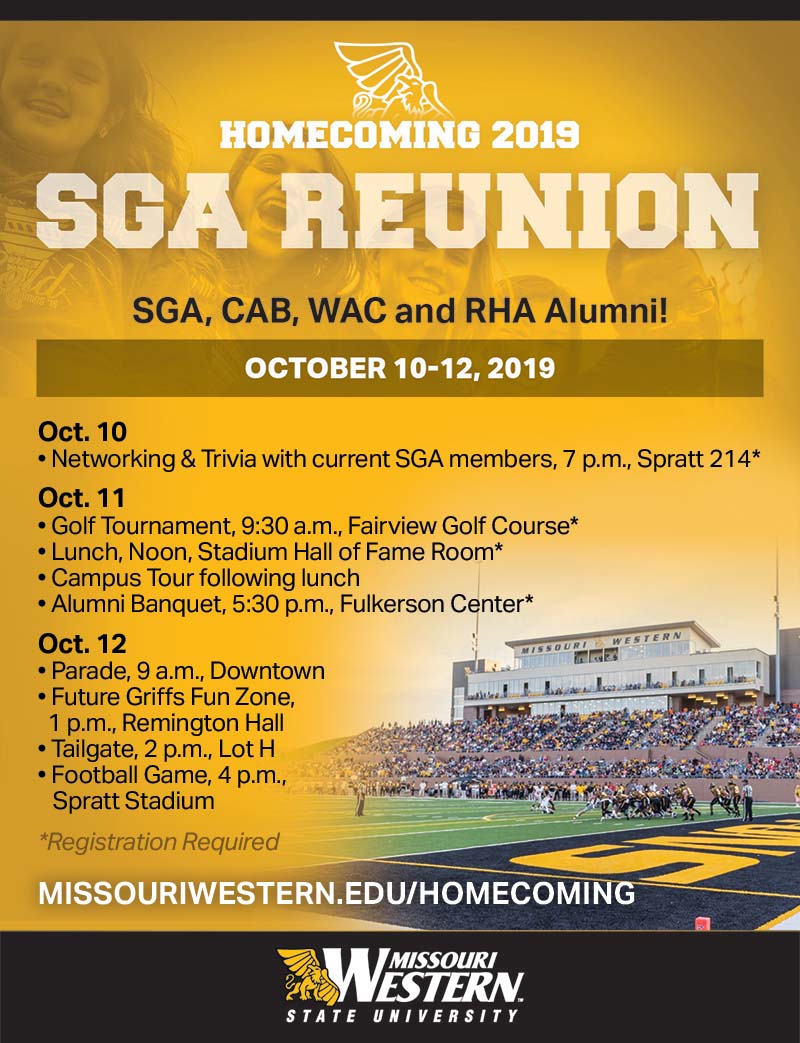 Join fellow SGA, CAB, WAC, and RHA alumni for two days worth of fun and reminiscing. We’ll start on the evening of Thursday, October 10 networking with current SGA members. On Friday, we’ll have a campus tour and lunch for alumni, and on Saturday join us for the parade, tailgate and football game!