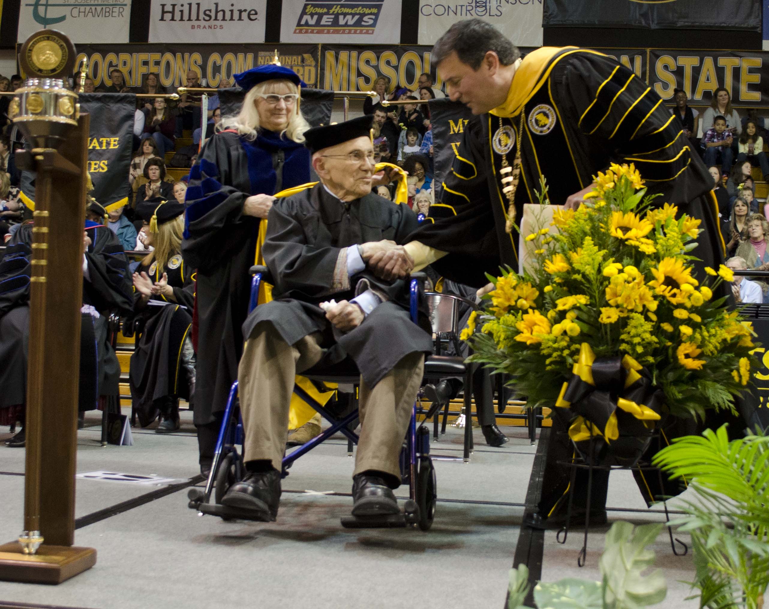 Dr. Joe Friedman ’39 received an honorary Doctorate of Humane Letters from Missouri Western in 2013.This year’s show is dedicated to Dr. Joe Friedman, a 1939 graduate of Missouri Western (when it was St. Joseph Junior College). Dr. Friedman was a St. Joseph native who left his practice as a podiatrist in 1962 for a remarkable career in theater and television, including 2,840 shows of “Fiddler on the Roof” with Hal Prince Productions. Dr. Friedman died earlier this year at the age of 95.