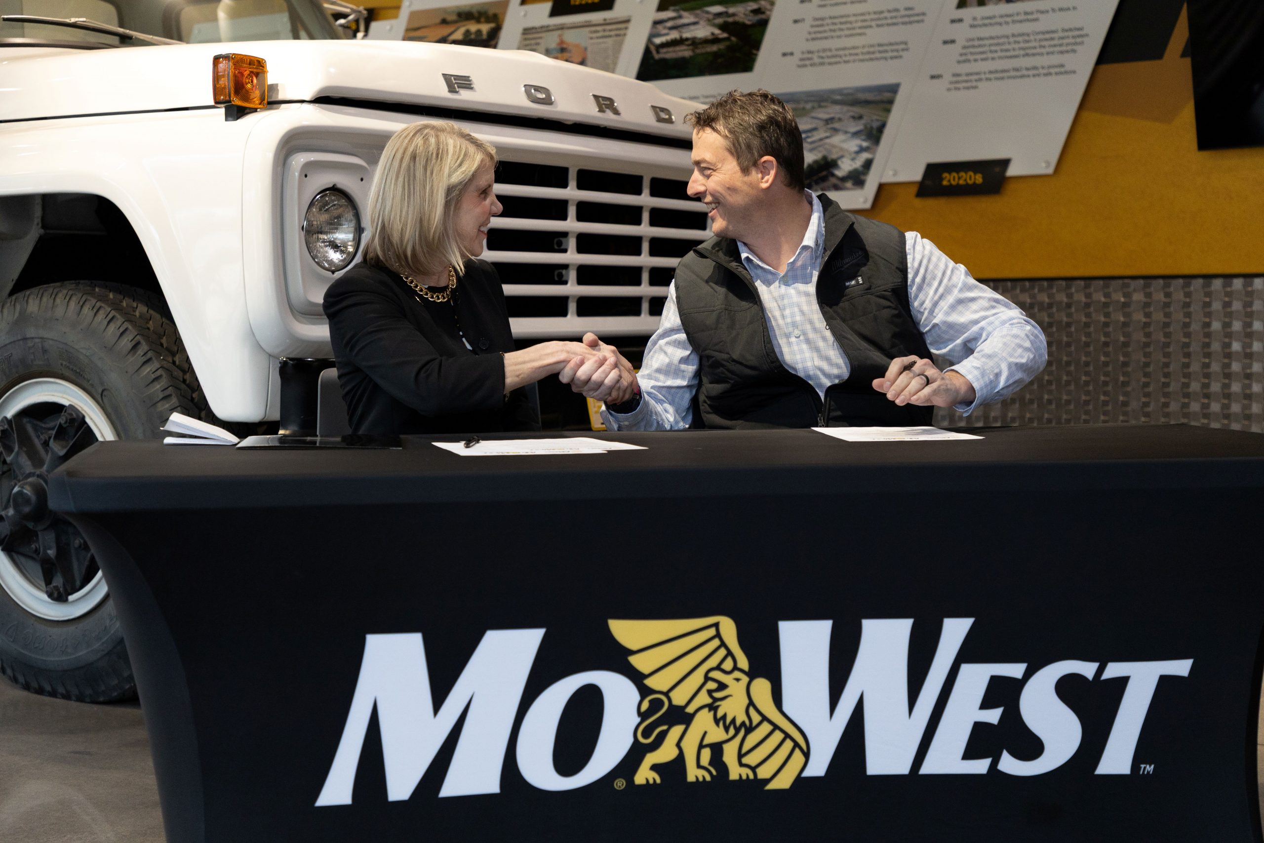 Dr. Elizabeth Kennedy, MoWest president, and Jonathan Arens, general manager of Altec Industries, shake hands after signing the partnership agreement.